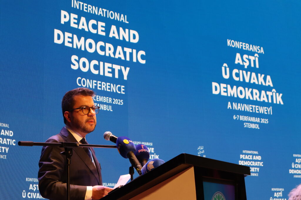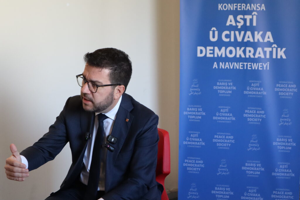 Davant d’un auditori a vessar amb representants polítics de diversos països, Aragonès ha expressat el seu ferm suport al poble kurd i a la seva lluita per la pau, la justícia i els drets fonamentals. Ha reivindicat la necessitat que el Kurdistan sigui reconegut com una nació lliure i democràtica i ha denunciat la repressió que pateixen tant la ciutadania kurda com els seus dirigents.