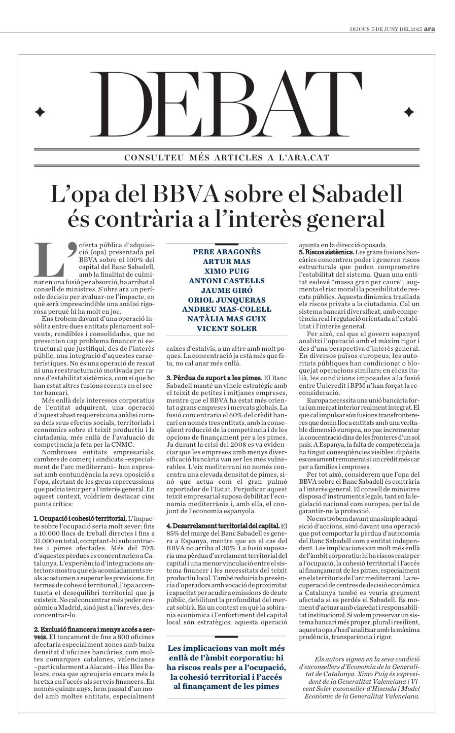 No ens trobem davant una simple adquisició d’accions, sinó davant una operació que pot comportar la pèrdua d’autonomia del Banc Sabadell com a entitat independent. Les implicacions van molt més enllà de l’àmbit corporatiu: hi ha riscos reals per a l’ocupació, la cohesió territorial i l’accés al finançament de les pimes, especialment en els territoris de l’arc mediterrani. La recuperació de centres de decisió econòmica a Catalunya també es veuria greument afectada si es perd el Sabadell. És moment d’actuar amb claredat i responsabilitat institucional. Si volem preservar un sistema bancari més proper, plural i resilient, aquesta opa s’ha d’analitzar amb la màxima prudència, transparència i rigor.