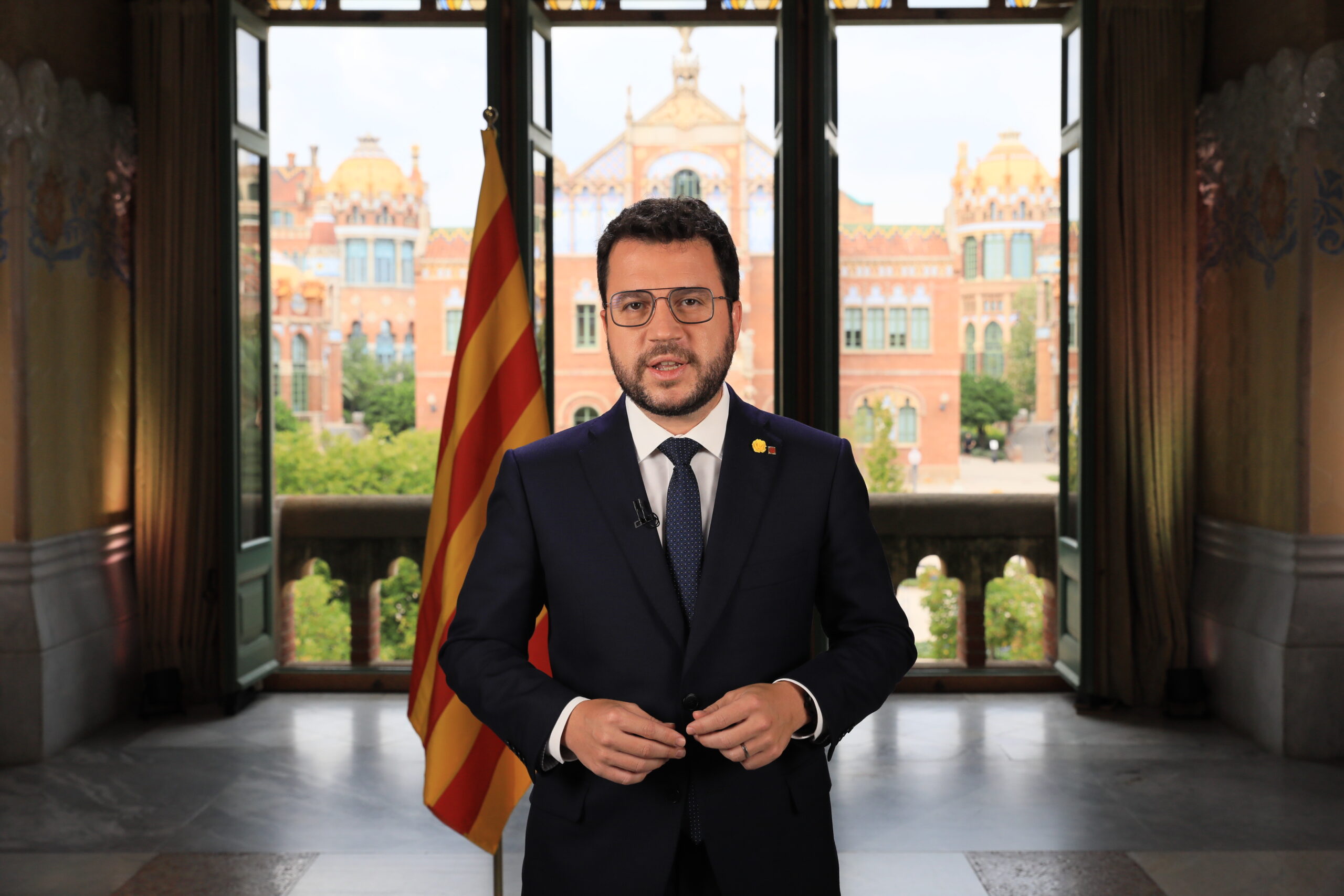 El president de la Generalitat, Pere Aragonès, va fer el seu primer missatge institucional amb motiu de l’Onze de Setembre, Diada Nacional de Catalunya, des del recinte modernista de Sant Pau, obra de l’arquitecte Lluís Domènech i Montaner, un espai de referència on conviuen història i innovació.