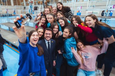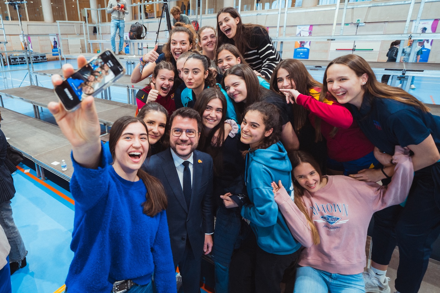 27/03/2023 El president Pere Aragonès es fotografia amb un grup d'esportistes a l'INEFC després d'anunciar el pla de millora dels equipaments esportius de Catalunya (Barcelona)