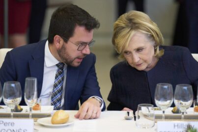 2/06/2023 El president Pere Aragonès conversa amb l'exsecretària d'Estat dels Estats Units, Hillary Clinton, a l'acte del 50è aniversari del CIDOB (Barcelona)